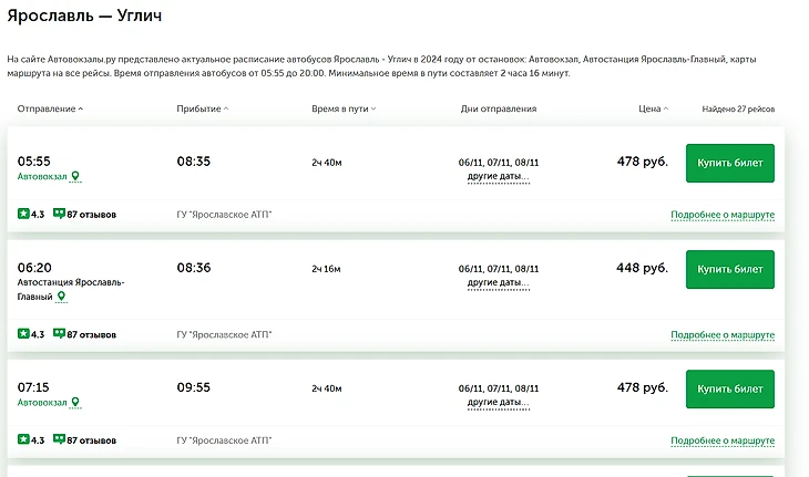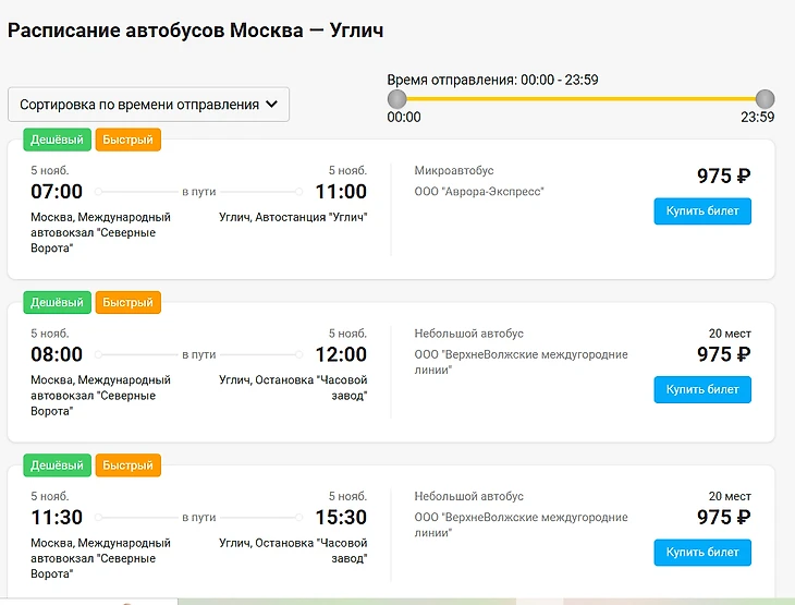 Автобусы в этом направлении отправляются с различных автовокзалов Москвы, в основном со Щелковского автовокзала и автостанции «Северные Ворота». Первый рейс отправляется утром, около 8:00, и прибывает на автовокзал Углича примерно через 4 часа. Это время предусматривает несколько коротких остановок, которые необходимы для отдыха водителя и пассажиров.