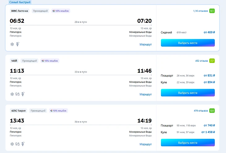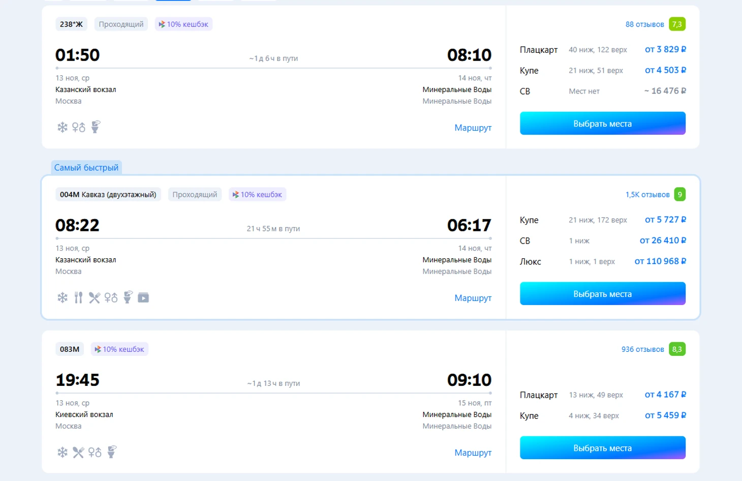 Доехать до Железноводска на поезде — хороший вариант для тех, кто хочет приехать с комфортом и по пути насладиться видами, а также избежать пересадок, как в случае с перелетом, где потребуется такси или автобус из аэропорта до Минеральных Вод. Вечерние рейсы позволяют выехать накануне и прибыть утром, отдохнув в пути.