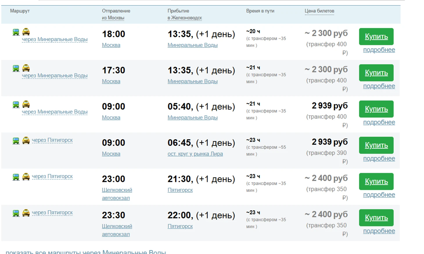 Чтобы добраться из Москвы до Железноводска на автобусе, потребуется одна пересадка в Минеральных Водах, так как прямого автобусного сообщения с Железноводском нет. Поездка с пересадкой будет удобной для тех, кто планирует бюджетное путешествие.