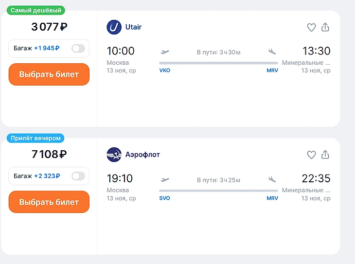 Авиакомпания Победа (DP 6913) предлагает прямые рейсы, вылетая из Шереметьево в 07:45 и пребывая в Минеральные Воды в 11:20. Цена билетов начинается от 3 490 рублей.