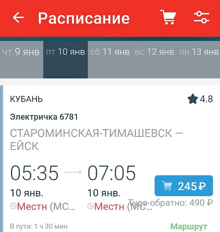 Пригородный поезд Староминская-Тимашевск — Ейск (6781) отправляется в 05:35 и прибывает в Ейск в 07:05: