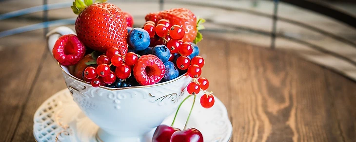 Возьмите свежие фрукты и ягоды. Яркие гранаты, лимоны, яблоки, груши, виноград, голубику, виноград, клубнику можно разместить в красивой вазе.