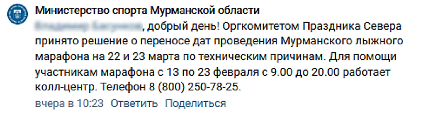 На вопросы участников в соцсетях Министерство спорта Мурманской области, отвечающее за проведение старта совместно с оргкомитетом и местной федерацией, сообщало, что причины переноса – технические.