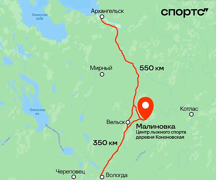 Из Санкт-Петербурга на машине предстоит проехать около 1000 км – по трассе А114 до Вологды, где нужно закупиться вологодским мармеладом, затем продолжить путь по трассе А8 до города Вельск, после которого свернуть по указателям на Центр лыжного спорта «Малиновка».