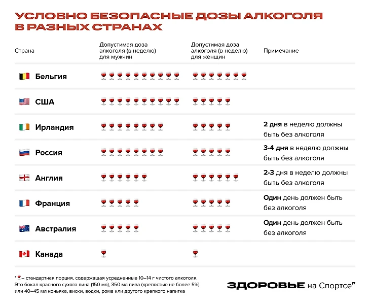 На рекомендации министерств здравоохранения разных стран по поводу норм спиртного влияют культурные особенности и методика, по которой оценивают риски. Например, Австралия установила условную безопасную норму из расчета, чтобы риск смерти не превышал один к ста.