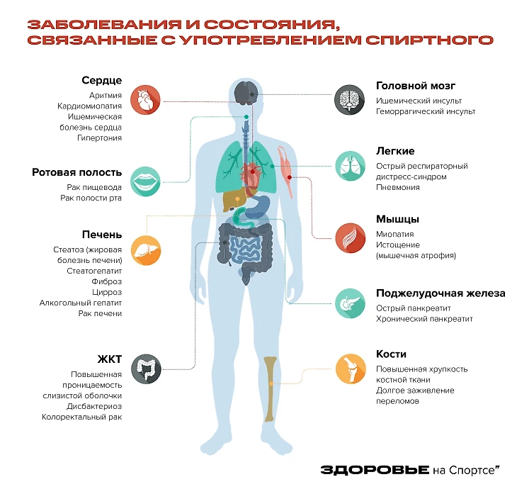 Спиртное нарушает работу всех органов и увеличивает риск более чем 200 болезней. Попадая в организм, алкоголь быстро всасывается в кровь и достигает головного мозга, где подавляет активность нервных клеток, замедляет скорость реакции, ухудшает память и снижает способность принимать решения.