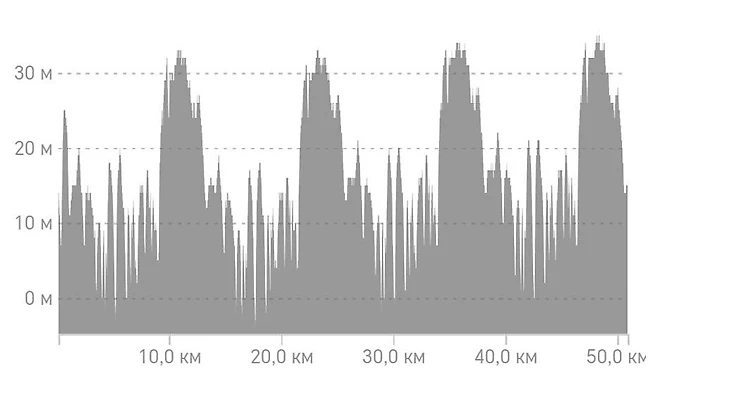 Анастасия Рыжова: «Трасса очень понравилась, по стандартам лыжных марафонов она считается скорее достаточно тяжелой: набор высоты на 50 км составляет 958 м по часам Garmin (разные часы выдают разные данные – Спортс’’). Подъемы не воспринимаются слишком тяжело, потому что они сами по себе небольшие, а за ними следуют такие же сравнительно небольшие спуски. Просто подъемов и спусков много.