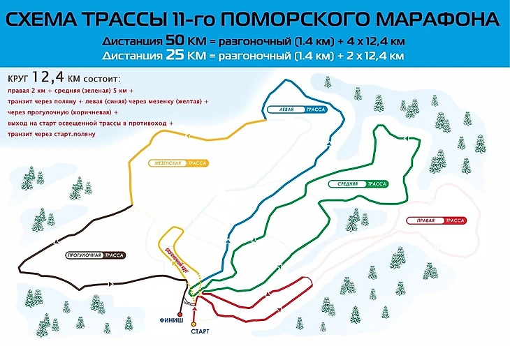 - Дистанции: 50 км, 25 км – свободный стиль, 25 км – классический стиль, детский забег на 12 км