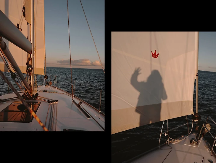Чтобы набрать максимальную скорость, в дополнение к мотору мы поставили паруса, превратив переход в гонку с самими собой и солнцем: успеем ли до темноты? Получится ли идти еще быстрее?Пришлось вспомнить все, что мы знаем про ветер и парус из гонок на спортивных базах Силы ветра, и чему научились в длинных перегонах по Северному морю и Атлантическому океану.