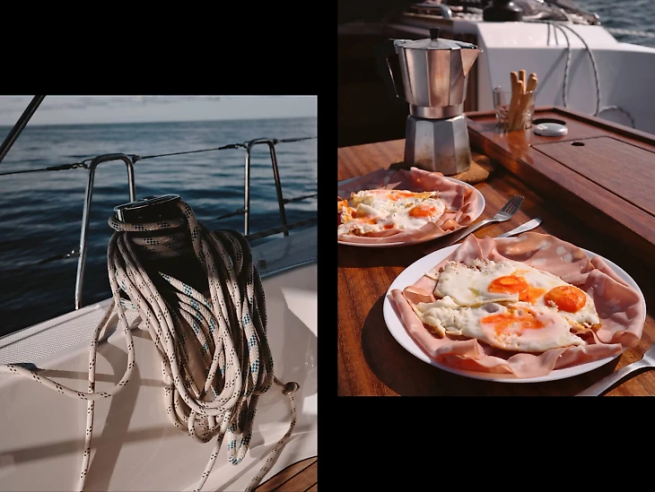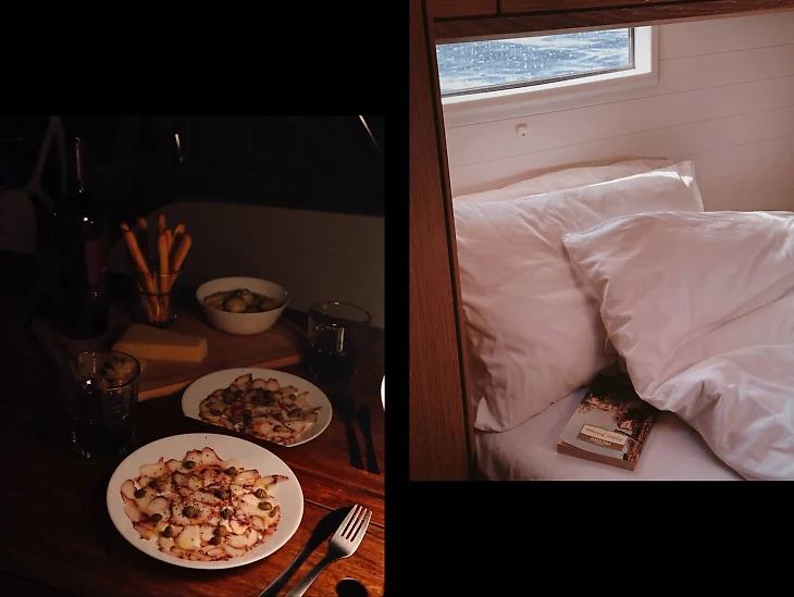 Управление яхтой, швартовки и планирование маршрута, и так, как правило, занимает далеко не весь экипаж. Поэтому именно бытовая часть путешествия вдвоем стала наиболее необычным опытом и отличием от приключения с командой.Во-первых — покупка продуктов и готовка еды. Эти моменты стали максимально похожи на нашу любимую домашнюю рутину. Мы решили отказаться от большой закупки в марине. Не было продуманного меню на неделю, гигантских упаковок воды и кучи бумажных полотенец, как это обычно бывает на регатах. Вместо этого мы просто заходили вечером в магазин и брали самые классные местные ингредиенты, на ходу придумывая, что из них приготовить: «Грибы порчини, отлично! Паста или ризотто?» К тому же готовить на двоих всегда проще и привычнее, чем на целую команду, а мыть посуду после ужина всего 10 минут. А еще в результате такого подхода к концу регаты у нас не осталось лишних продуктов. Не пришлось ничего выбрасывать или отдавать другим командам.
