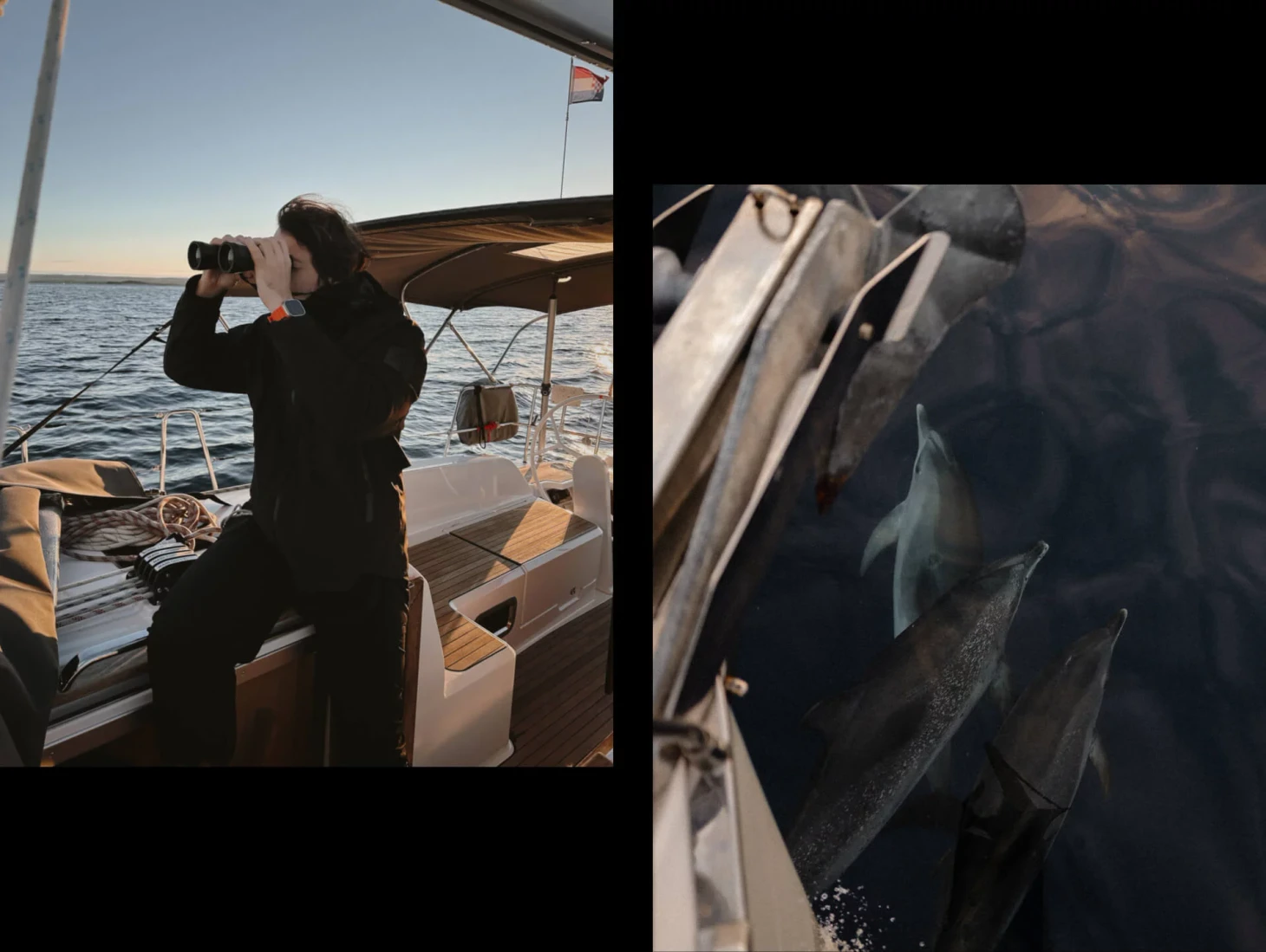 В итоге лодка шла стабильные 8 узлов, легкий крен не мешал варить кофе, да и к тому же ни минуты не было скучно — постоянно хотелось настроить паруса еще точнее. А еще надо было внимательно следить за движением рыбацких лодок и туристических паромов.По дороге мы видели потрясающий рассвет над морем, встретили целую стаю дельфинов, приготовили красивый завтрак — и все это было только для нас двоих.