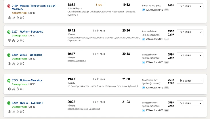 Пригородные поезда в нужном направлении отправляются с Белорусского вокзала, а также с промежуточных станций Москвы: Беговая, Фили, Кунцево-1. Доступны два типа поездов: