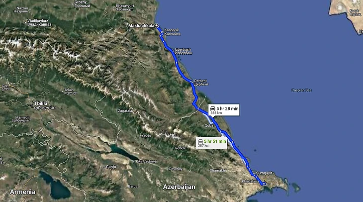 На машине поездка из Дербента в Баку займет около 4–5 часов, включая прохождение границы. Основной маршрут проходит по трассе Р-217 «Кавказ», затем через КПП «Яраг-Казмаляр» и далее по азербайджанской трассе М1.