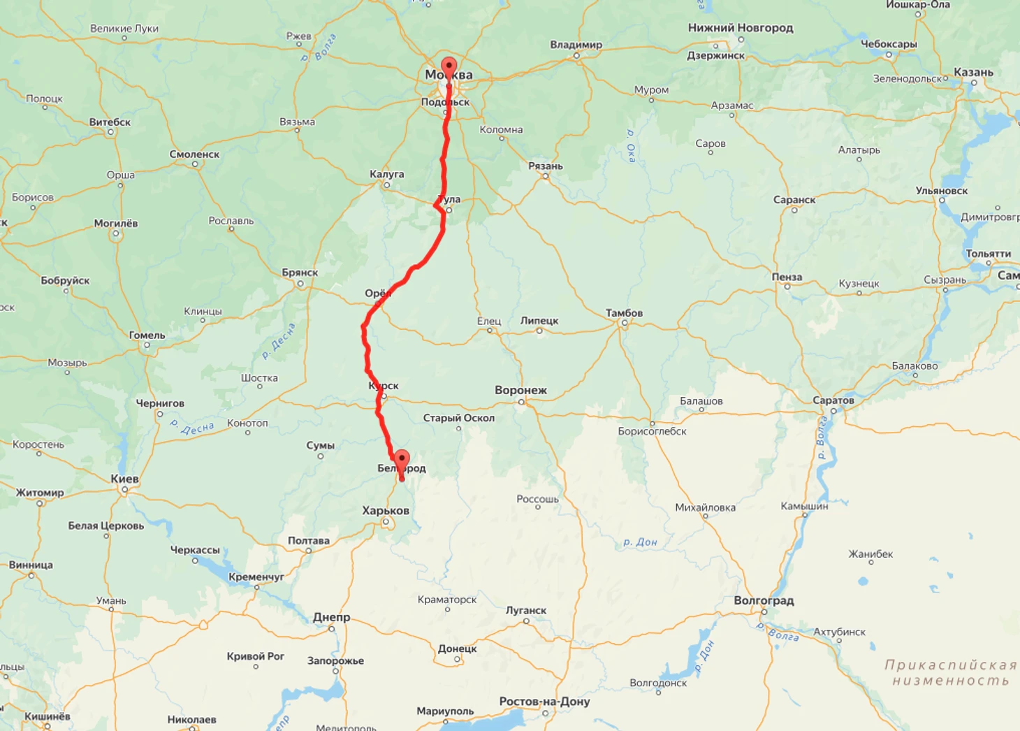 М-2 «Крым» (650 км, ~7-8 часов). Москва → Подольск → Серпухов → Тула → Плавск → Орел → Курск → Белгород.