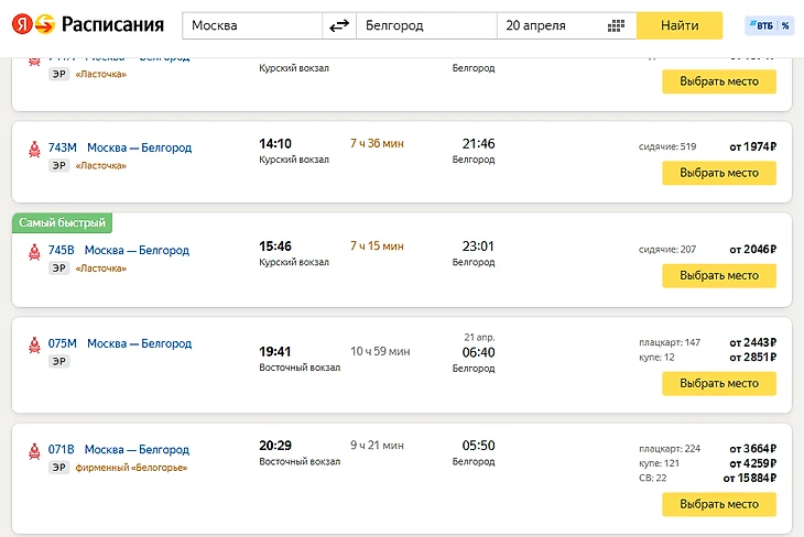 Для сравнения мы добавили доступные варианты, как доехать до Белгорода, указав примерное время в пути и стоимость.