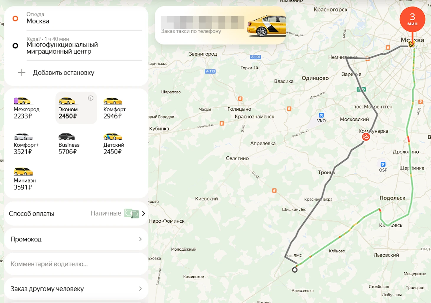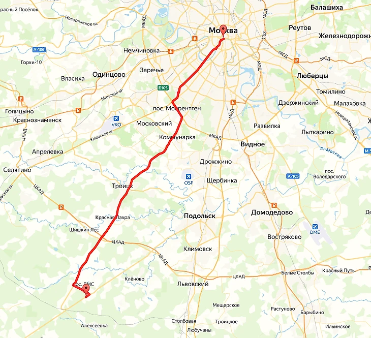 Аналогичное расстояние и по маршруту через Подольск. В этом случае большая часть дороги пройдет по Варшавскому шоссе. Через Одинцово или Апрелевку продолжительность поездки на 20-30 километров больше.