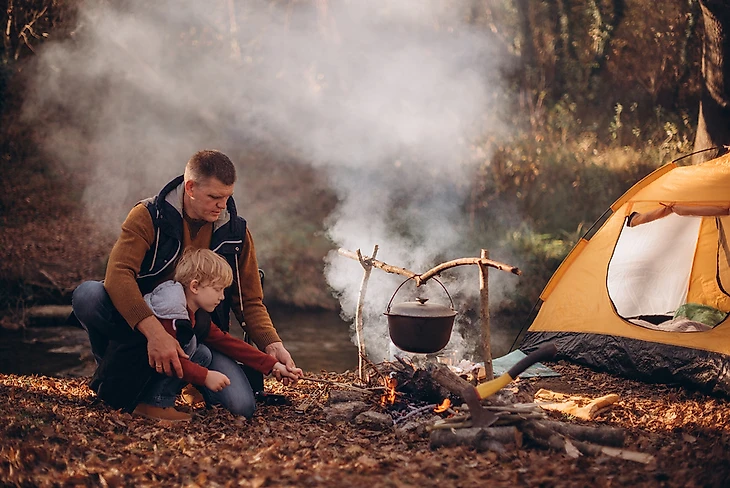 Man and boy tourists autumn time leisure, vacation hiking or traveling touristic activity. Family camping, father and little son relax in forest camp.
