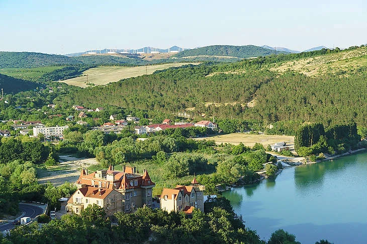 Вид со смотровой площадки на северную окраину курортного поселка Абрау-Дюрсо в городском округе Новороссийска. Солнечный летний день на берегу озера Абрау (2018 год)