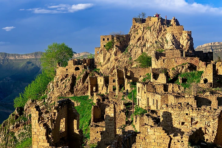View of the abandoned village of Gamsutl on top of a mountain in Dagestan, with tourists among the ruins (2022 год)