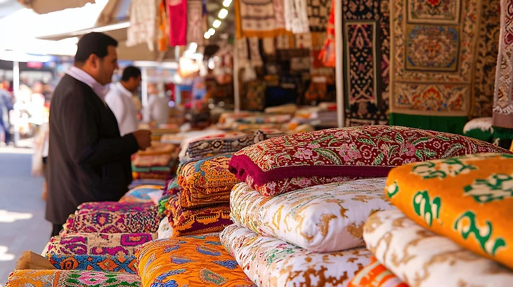 Красочные ткани на яркой рыночной сцене в Таджикистане для постеров о путешествиях и культуре