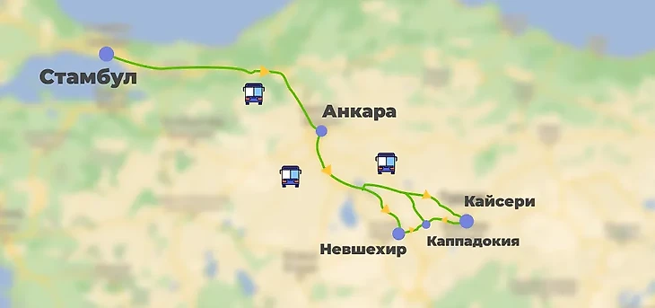 Отправление происходит с автобусных терминалов в Стамбуле: Esenler Otogar (европейская часть) и Alibeyköy Otogar. Конечной точкой может быть Невшехир, Гереме или Ургюп — в зависимости от маршрута.