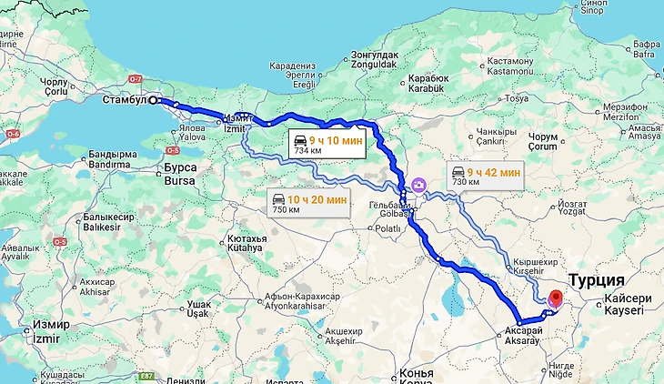 Расстояние между Стамбулом и Каппадокией — около 750 км. Время в пути — 8–10 часов в зависимости от маршрута и количества остановок. Самый прямой путь проходит через Анкару по трассам O-4 и D750. Маршрут: Стамбул → Измит → Анкара → Аксарай → Гереме. Трассы в хорошем состоянии, движение в основном спокойное. Большая часть дороги — платная автомагистраль, с четкой навигацией и заправками каждые 30–40 км.