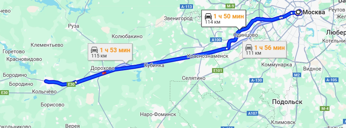В хорошую погоду и без пробок — около 1,5 часов. Утром в будни или вечером в пятницу возможны заторы на выезде из Москвы, особенно в районе Одинцово и Кубинки. Чтобы избежать плотного трафика, лучше выезжать в первой половине дня или после 19:00.