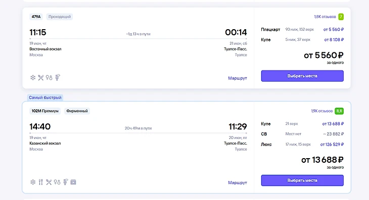 Москва — Туапсе: от 6300 рублей в купе, от 5500 рублей в плацкарте.