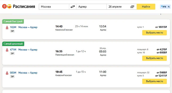 Посмотреть расписание поездов, стоимость билетов, приобрести их, а также другую информацию о том, как добраться до Адлера на поезде, можно на сайте РЖД и различных тематических сервисах: «Яндекс-расписание», Tutu. Можно посмотреть вариант поездки на поезде из любого города России. Билеты лучше приобрести заранее, особенно летом, обычно хорошие места быстро раскупают.