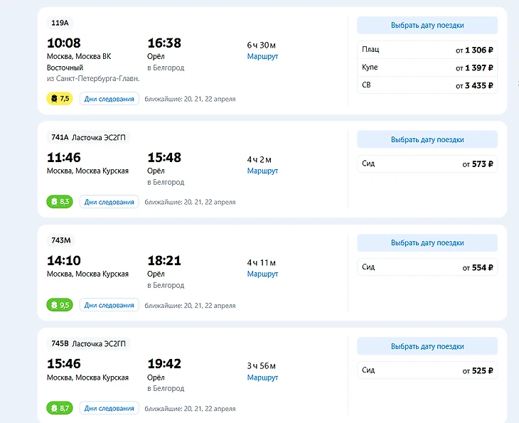Москва — Курск: стоимость билетов стартует от 763 рублей.