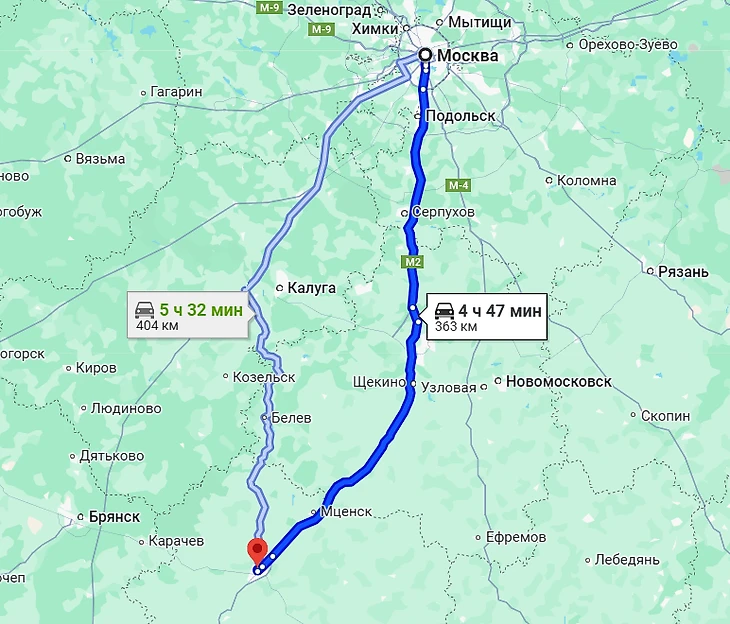 Выезд из столицы проходит через Симферопольское шоссе, далее — мимо Подольска, Серпухова и Тулы. Оттуда дорога ведет через Щекино, Чернь и Мценск. По пути есть заправки, придорожные кафе, точки для отдыха.