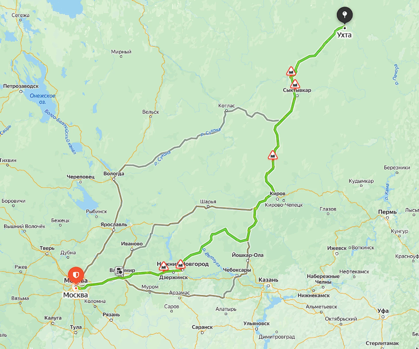 Самый короткий маршрут из Москвы в Ухту – 1621 километр. Он пролегает через Ярославскую, Костромскую, Кировскую область и Республику Коми. При расходе топлива в 10 литров на 100 километров и цене в 56 рублей, стоимость топлива составит 9078 рублей. Это без учета проезда по платным участкам, придется заплатить еще около 2000.