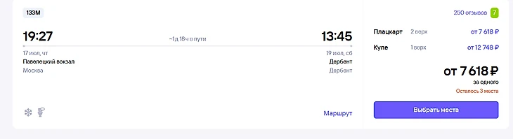 Как добраться до Дербента из Москвы: Поезд №133М отправляется с Павелецкого вокзала. Время в пути — около 1 дня 18 часов. Цена билета в плацкартном вагоне — от 7 618 рублей, в купе — от 12 748 рублей.