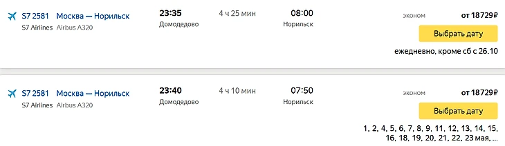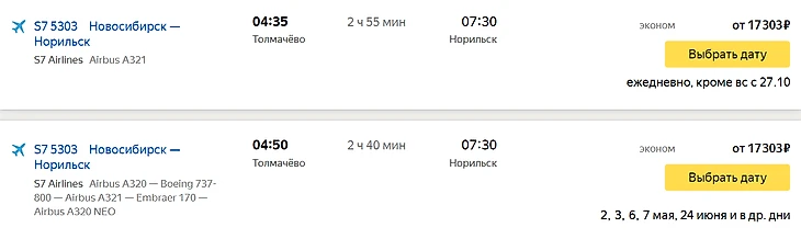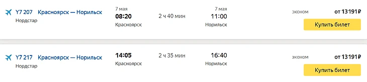 Стоимость билетов эконом-класса в обоих случаях от 13 191 рубля. Рейсом Y7 207 можно добраться до Норильска ежедневно, рейс Y7 217 вылетает по четным дням. Внимательно смотрите расписание, в некоторые дни время вылета может меняться.