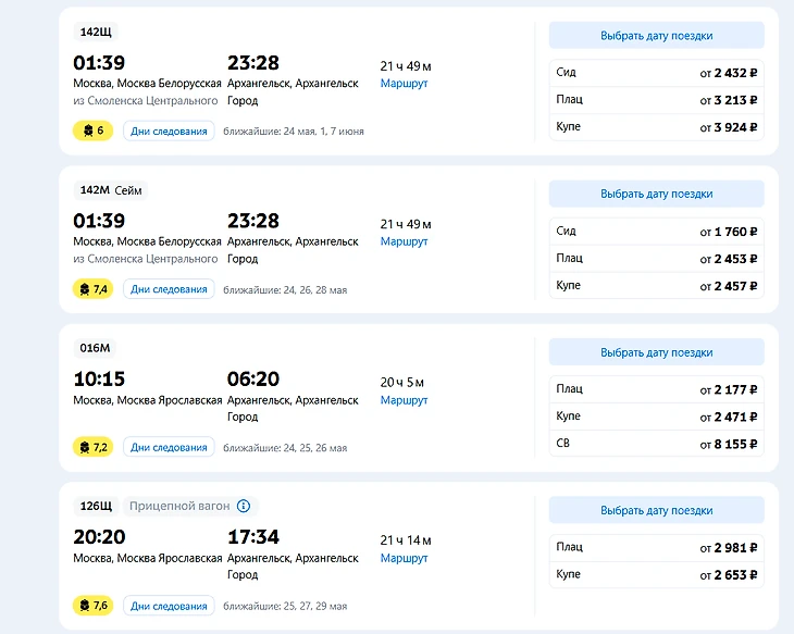 Поезд №16М Москва — Архангельск: отправление утром, прибытие на следующий день довольно рано..