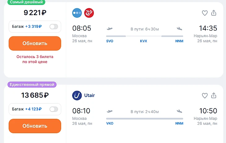 Цены на авиабилеты зависят от сезона, спроса и времени бронирования. В среднем стоимость перелета из Москвы в Нарьян-Мар составляет от 9 000 до 15 000 рублей в одну сторону. При раннем бронировании или во время распродаж билеты можно найти и за 7 000 рублей.