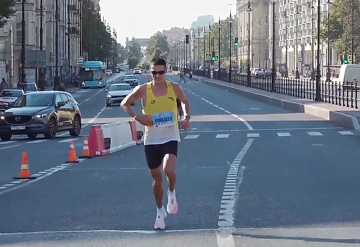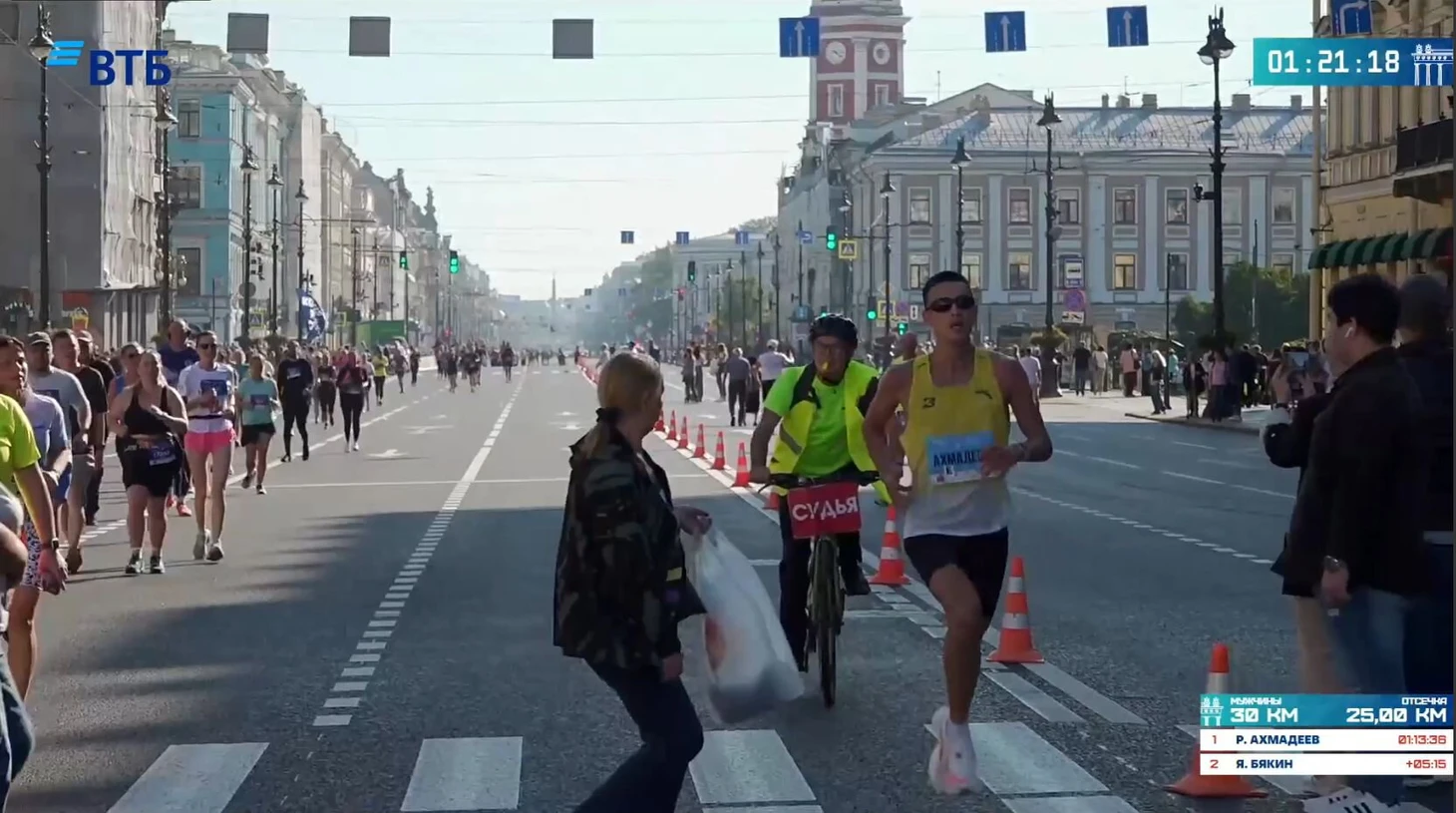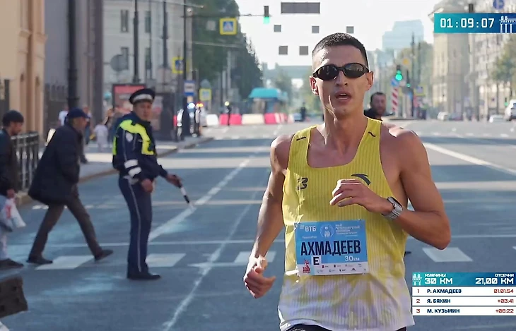 Ахмадеев стартовал с Ярославом Бякиным – бывшим лыжником, который год назад пейсил Ринаса на этой же дистанции. Бякин почти не бегал последние два месяца из-за травмы, только катался на лыжероллерах и велосипеде – и сразу заявил, что не будет гнаться за Ринасом, а побежит ровно по 3:00 мин/км. Первую пятерку они бежали вместе, но потом Ахмадеев резко взвинтил темп – по данным трансляции доходило до 2:47 мин/км.