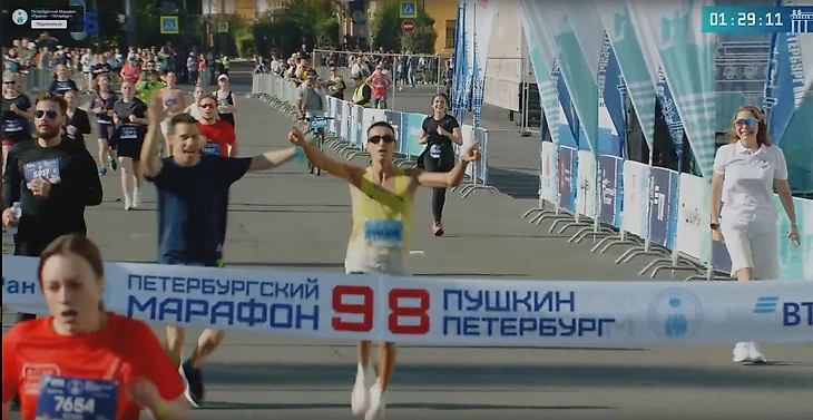 PushkinRun в этом году сделали классную трансляцию старта: минимум 4 камеры на трассе, которые показывали и лидеров 30 км по мужчинам, и лидеров марафона, и победителей десятки. Еще были промежуточные точки на дистанции и на финише, где включались стационарные камеры. Обзор – супер.