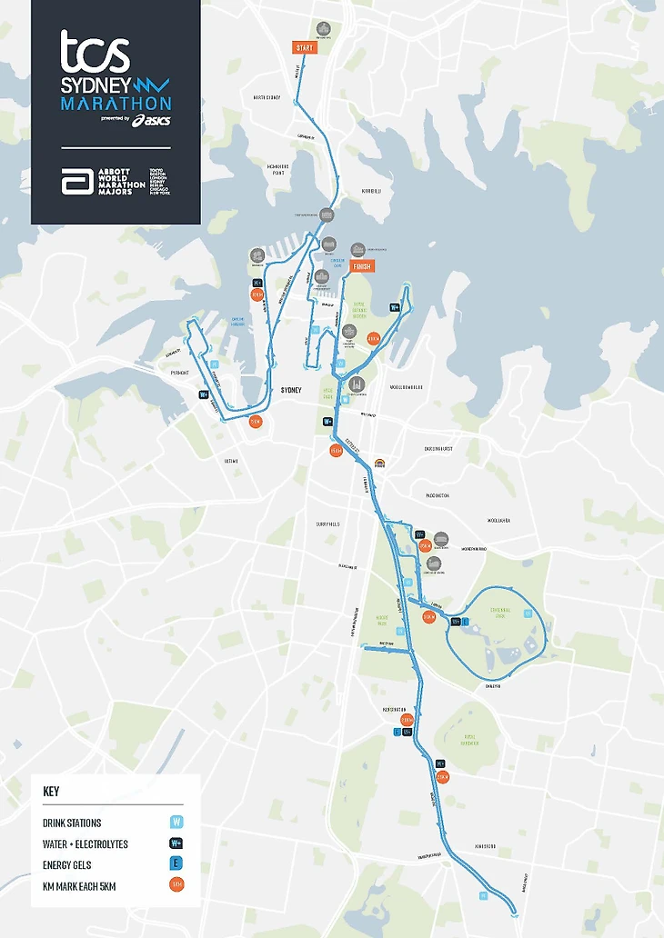 Начинается трасса Сиднейского марафона в том же месте, что и олимпийская дистанция – на Миллер-стрит в Северном Сиднее, и ведет бегунов через знаменитый мост Харбор-Бридж, который полностью перекрывают во время забега.