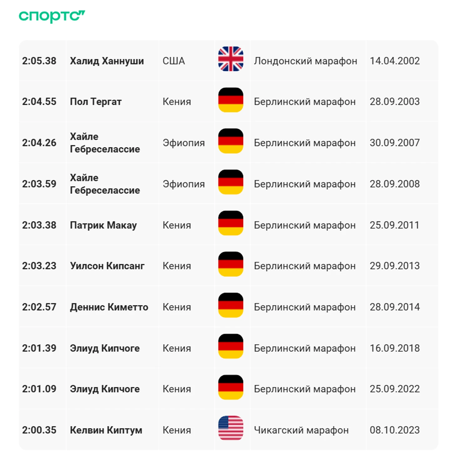 Кроме того, Берлин считается одной из самых быстрых марафонских трасс мира – он принес немало мировых рекордов. Впервые в Берлине мировой рекорд установил в 1998 году бразилец Роналду да Коста. Из последних десяти мировых рекордов у мужчин восемь установлены именно на трассе Берлинского марафона. Среди них – результат Элиуда Кипчоге 2:01:09 в 2022 году. У женщин рекорд в Берлине установила Тигист Ассефа – 2:11:53 в смешанном марафонском забеге в 2023 году (мировой рекорд спустя год побила в Чикаго Рут Чепнгетич, обогнав Ассефу почти на 2 минуты).