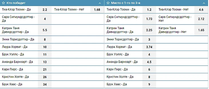 Женский индивидуальный зачет. Возможность поставить на победителя и также тройку. У фаворита Тиа-Клэр Томми пока высокий коэффициент 2.2, конечно если сравнивать с Фрейзером, в нее "1xbet\ставка" верит меньше.