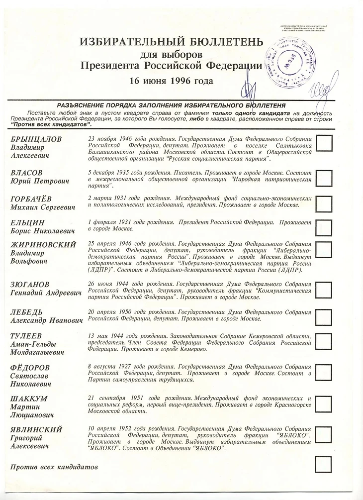 Штаб Бориса Ельцина предлагал сотрудничество Юрию Власову в обмен на снятие кандидатуры, но олимпийский чемпион категорически, по его собственным словам, отказался это делать. Кстати, перед выборами против Власова по почтовым ящик во многих городах распространили чернуху – некролог, что спортсмен умер и его фамилии в бюллетени не будет.