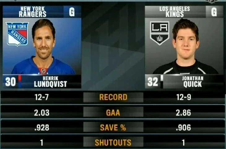 Специфика игры обоих голкиперов хорошо известна. «Король» Лундквист хорош на линии ворот, где он может совершать самые невероятные спасения, а Куик здорово выкатывается на встречу нападающим, сокращая угол обстрела. Хэнк стоит на ногах до последнего, а Джонатан сразу опускается на колени, из-за чего частенько пропускает броски над блином. Зато Хэнк не фанат толкотни на пятаке, а это «удовольствие» «Лос-Анджелес» ему обеспечит. Он начинает финал с лучшей статистикой (см. фото), но то же было и у Кори Кроуфорда пару недель назад.