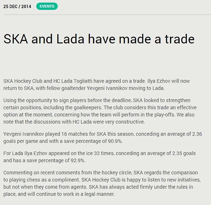 16.03 «Учитывая возможность точечного усиления, до окончания периода дозаявок в КХЛ селекционной службой СКА осуществлялся мониторинг вариантов оптимизации состава по конкретным позициям, включая вратарскую линию. Клуб считает данный обмен наиболее эффективным, в том числе, с точки зрения выступления команды в плей-офф и отмечает конструктивный характер диалога с ХК «Лада»», – как вам цитатка? Нееееет, это не кандидатская на тему «Селекция СКА. Бессмысленная и беспощадная», а цитата с официального сайта армейцев. Подождите, сейчас вообще лакомый кусок оттуда достанем.
