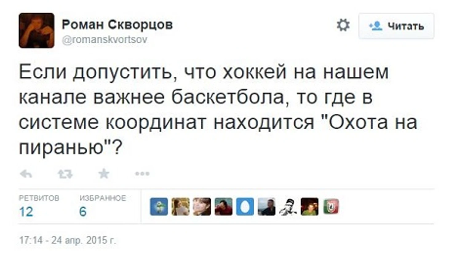 Роман Скворцов: «Если допустить, что хоккей на «России 2» важнее баскетбола, то где в системе координат находится «Охота на пиранью»?»