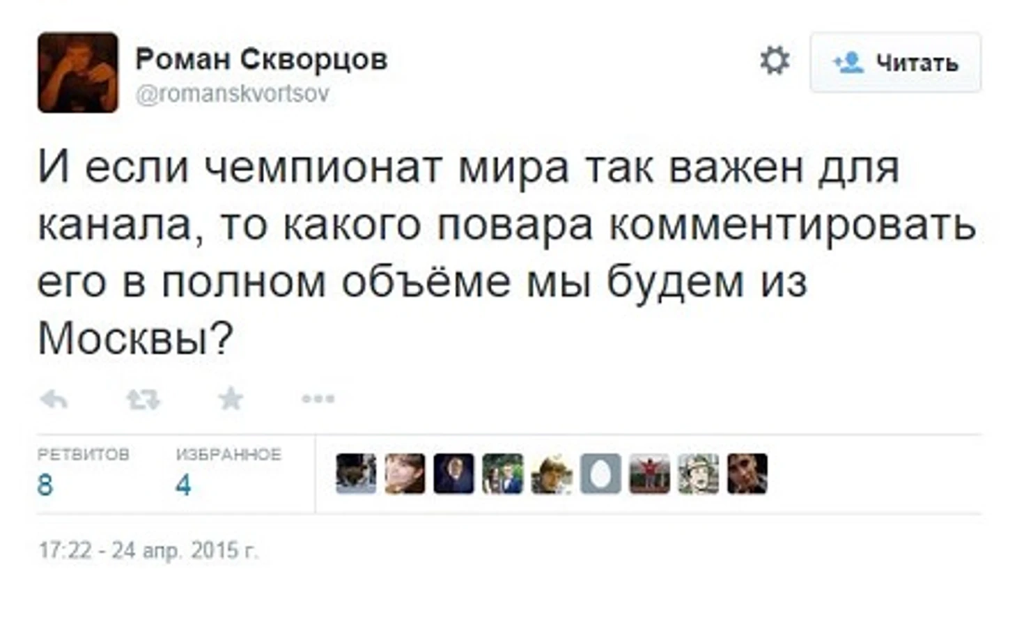 И если чемпионат мира так важен для канала, то какого повара комментировать его в полном объеме мы будем из Москвы?» – написал Скворцов в своем в твиттере.