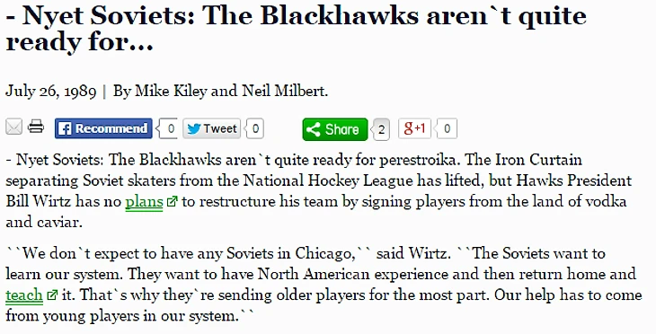 0.04 Занятная история о «Чикаго» из 1989 года. Бывший владелец и президент клуба Билли Вирц об игроках из СССР: «Советские игроки хотят получить опыт игры в Северной Америке, затем вернуться домой и передавать его там другим хоккеистам. Поэтому нам присылают только возрастных игроков».
