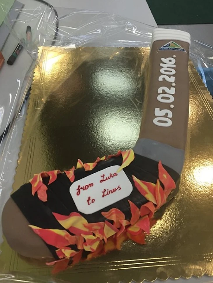 Кондитерское изделие выполнили в виде горящей клюшки.