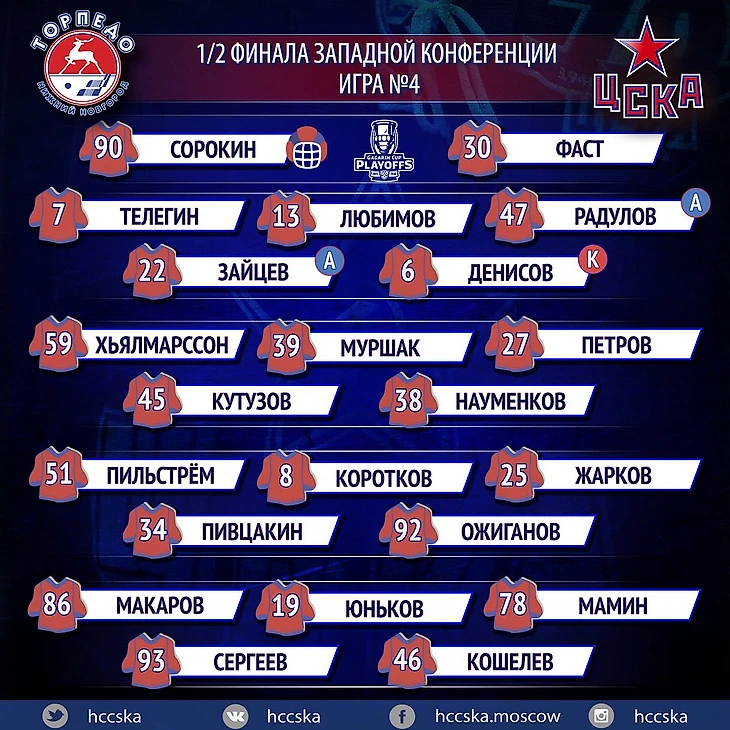 Стал известен состав ЦСКА на четвертый матч серии второго раунда плей-офф Кубка Гагарина с «Торпедо».