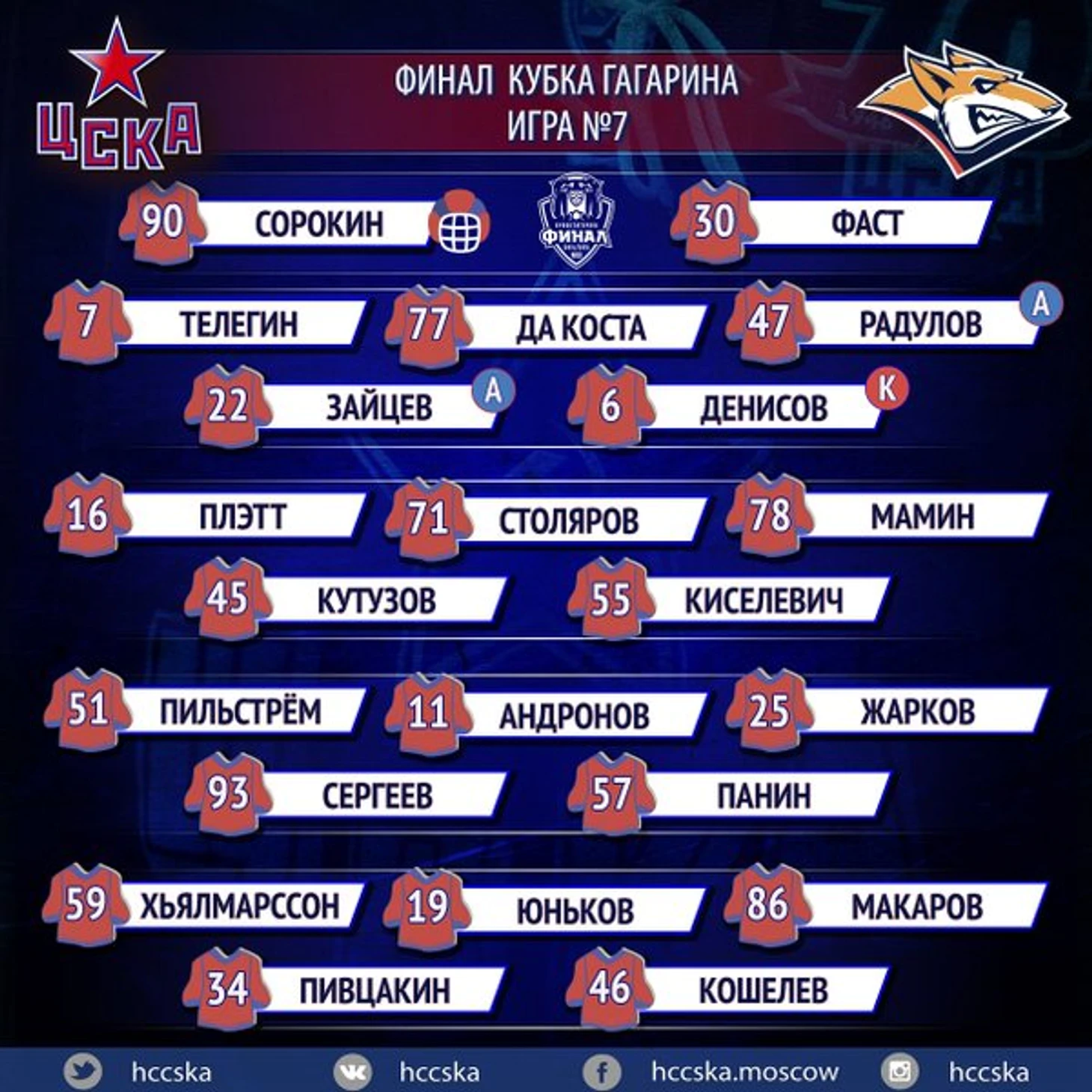 Стал известен состав ЦСКА на седьмой матч финала Кубка Гагарина против «Магнитки».